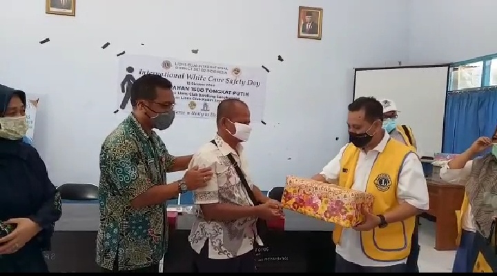 KEDIRI-Dalam rangka memperingati hari tongkat putih dunia, Lions Clubs Kediri Jayabaya membagikan tongkat putih kepada Penyandang Tuna Netra, bertempat di Aula Kantor Dinasol Sosial Kabupaten Kediri, Kamis (15/10/2020)