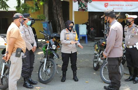 Surabaya – Kapolres Pelabuhan Tanjung Perak, AKBP Ganis Setyaningrum, S.Si, MH, memantau langsung pengamanan jalur lintasan unjuk rasa di wilayah hukumnya di Jalan Margomulyo dan Dupak Rukun, Surabaya. Kamis (15/10/2020).