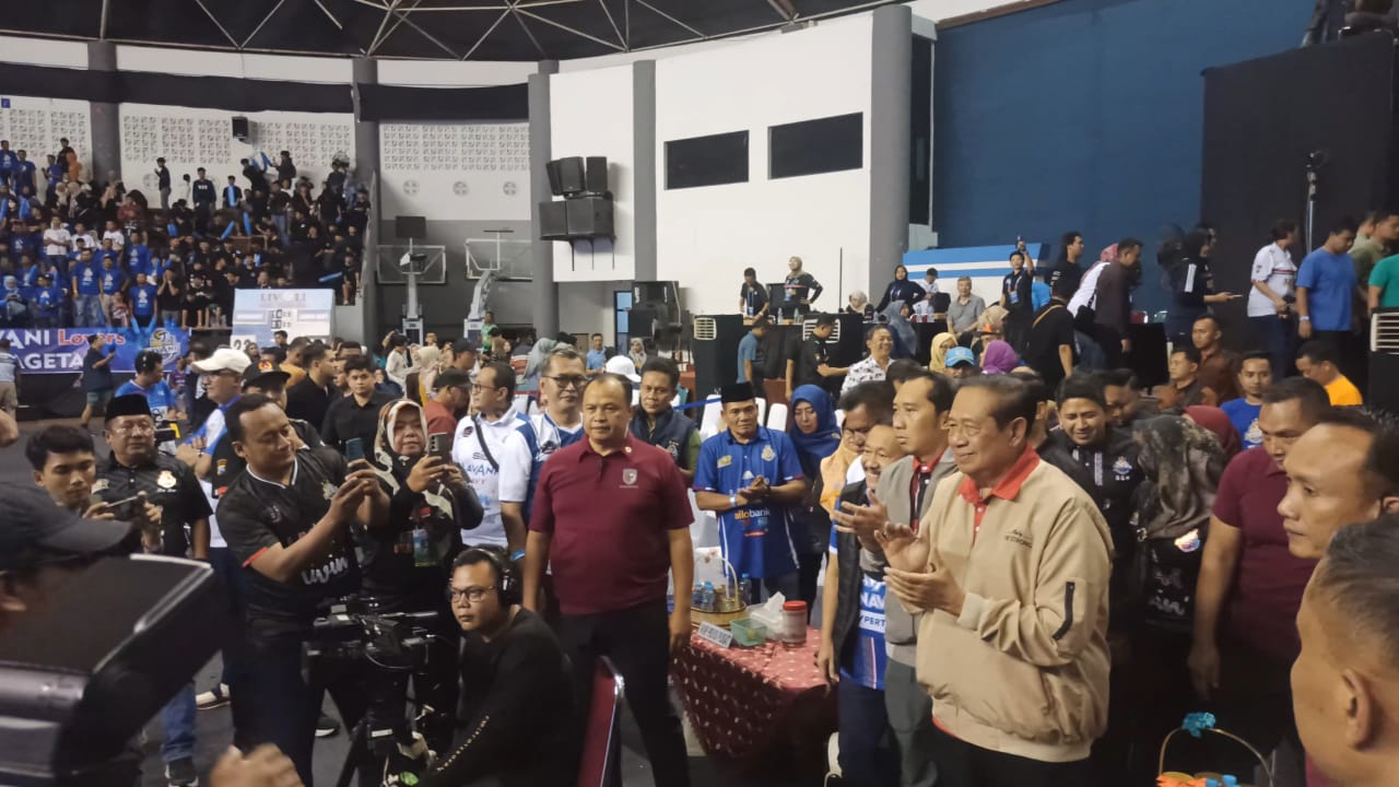 Magetan | jatim.siberindo.co – Presiden ke-6 Republik Indonesia, Susilo Bambang Yudhoyono (SBY), kembali menunjukkan kecintaannya pada olahraga bola voli. SBY hadir langsung di GOR Ki Mageti, Magetan, Jawa Timur, untuk memberikan dukungan moral kepada timnya, Bogor Lavani Navy melawan Indomart, yang berlaga di ajang bergengsi Livoli Divisi Utama 2025. Selasa malam (14/10/2025).