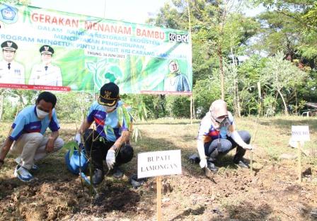 LAMONGAN, Jatim.siberindo.co – Peduli terhadap lingkungan, Bupati Lamongan Yuhronur Efendi bersama Wabup Abdul Rouf dan Pimpinan Wilayah BRI Surabaya Triswahyu Herlina melakukan Gerakan Menanam Pohon Bambu di Tempat Pembuangan Akhir (TPA) Tambakrigadung Kecamatan Tikung, Rabu (16/06/2021).