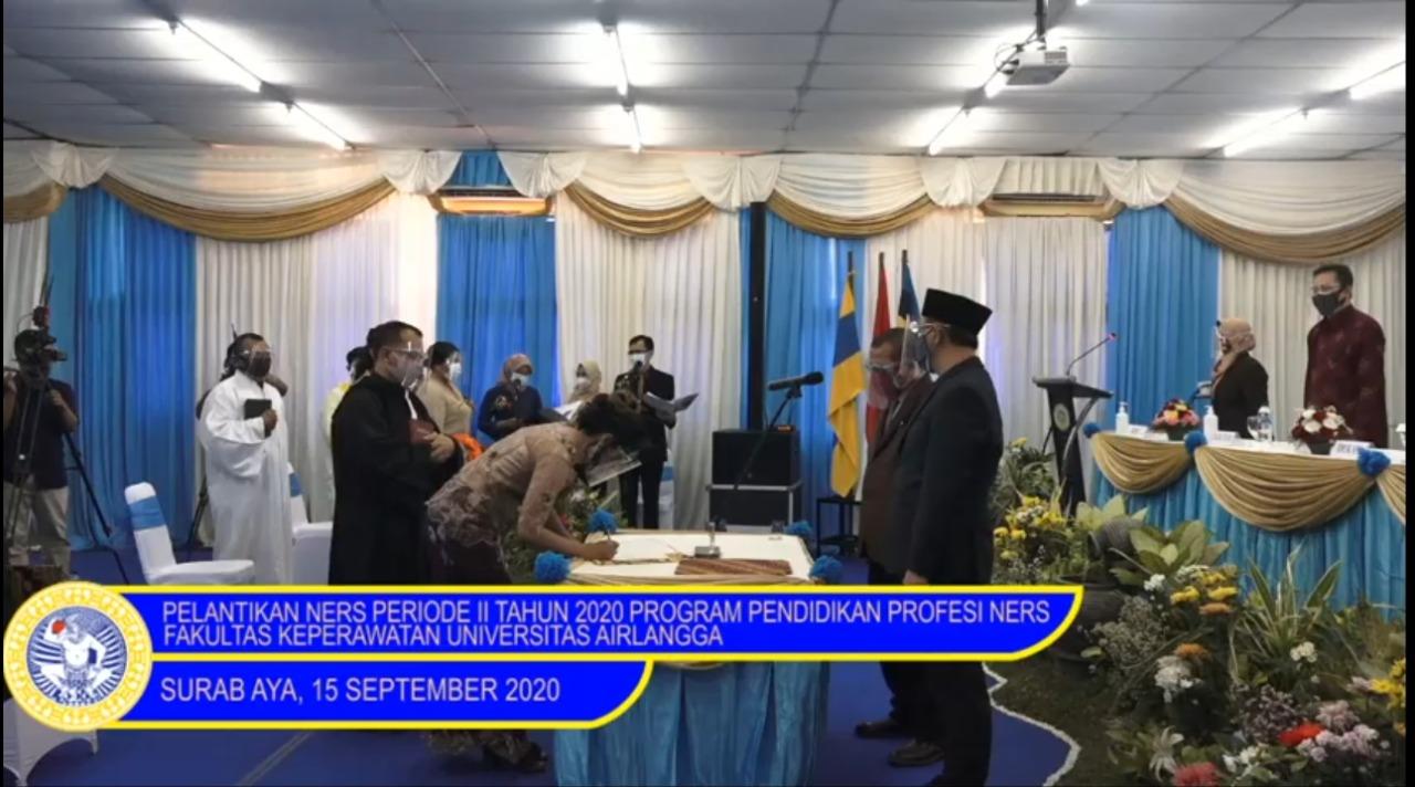 SURABAYA, Fakultas Keperawatan (FKp) Universitas Airlangga (UNAIR) kembali melantik 114 calon perawat baru pada Selasa (15/9/2020). Pelantikan periode kedua tahun 2020 tersebut diselenggarakan secara offline di Ruang Kuliah Florence Nightiangle, Gedung FKP UNAIR. Tidak lupa untuk memfasilitasi para lulusan yang berada di luar kota, FKP UNAIR juga menggelar acara secara daring melalui via Zoom dan live streaming Youtube.