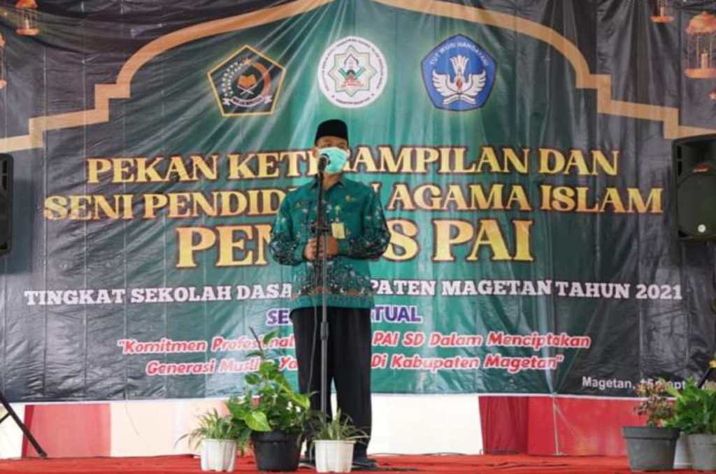 Dengan mengusung tema “Komitmen Profesinalisme Guru PAI SD Dalam Menciptakan Generasi Muslim Yang Islami Di Kabupaten Magetan”, pelaksanaan pentas seni kali ini digelar secara langsung dan virtual di SD Unggulan Magetan, dengan tetap menerapkan Protokol Kesehatan (Prokes) ketat, Rabu (15/09/2021).