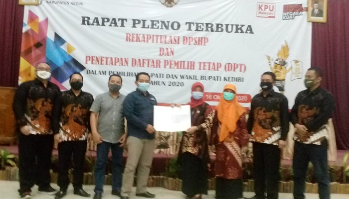 KEDIRI – Komisi Pemilihan Umum (KPU) Kabupaten Kediri, Jum’at 16 Oktober 2020 siang, menggelar rapat pleno terbuka rekapitulasi DPSHP dan penetapan Daftar Pemilih Tetap (DPT) dalam Pemilihan Bupati dan Wakil Bupati Kediri tahun 2020