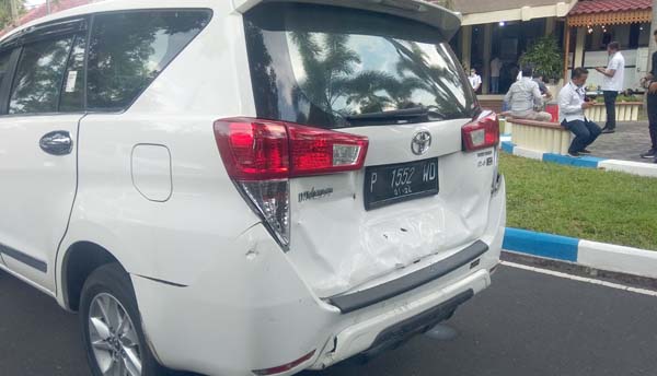 BONDOWOSO – Kijang Innova plat merah milik Bagian Umum Sekretariat Daerah Kabupaten (Sekdakab) Bondowoso dengan Nopol P 673 AP yang mengangkut rombongan komisi V DPR RI terlibat kecelakaan karambol di lampu merah Gardu Atak, Desa Cindogo, Kecamatan Tapen atau pertigaan lampu merah menuju Kawah Ijen, Kamis (15/10). Beruntung dalam kecelakaan karambol yang melibatkan empat mobil tersebut tidak ada korban jiwa dan hanya mengalami kerugian materiil.