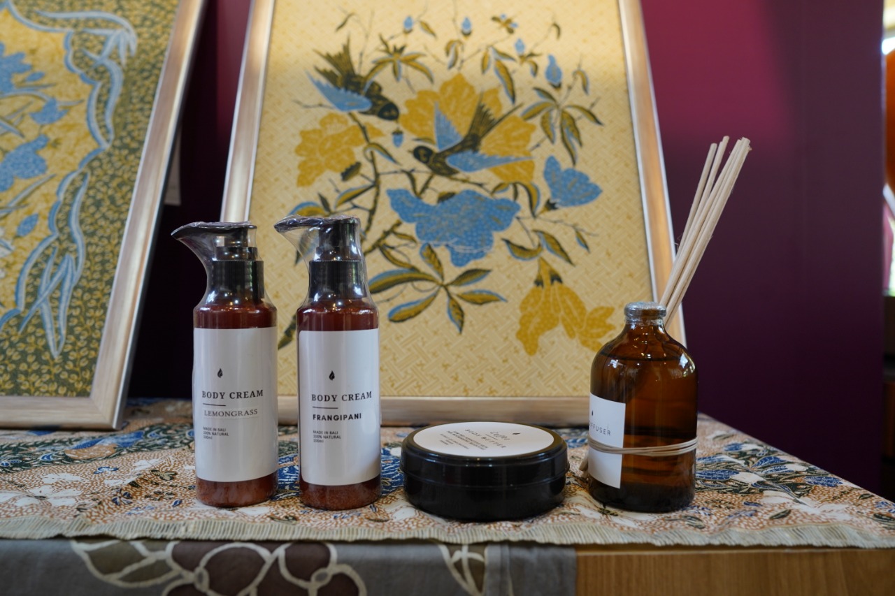 “Dalam proses produksi pembuatan produk aromaterapi dan kosmetik kami hanya menggunakan bahan-bahan alami dan juga menggunakan limbah bekas upacara adat Bali seperti batok kelapa dan dagingnya untuk diolah menjadi handicraft.” terang Komang.