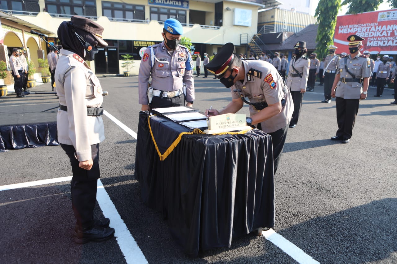 Selanjutnya, dilakukan Pelepasan dan Penyematan atau Penanggalan Pangkat oleh Kapolres Pelabuhan Tanjung Perak, dan Pejabat yang serah terima Penandatangan Integritas, serta dilanjutkan Pengambilan Sumpah oleh Inspektur Upacara.