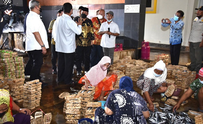 Kepala BNPT didampingi Wakil Bupati Lamongan dan Pemilik Usaha berkesempatan meninjau langsung proses pembuatan ikan serta bercengkerama dengan para pegawai yang ada di tempat pengolahan ikan tersebut.
