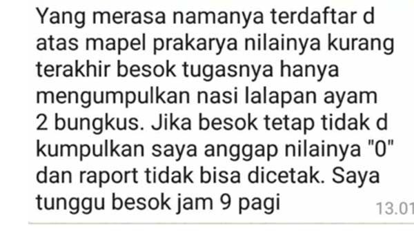 Selain itu, bagi murid yang nilai prakaryanya di bawah KKM akan diberi sanksi untuk membuat ayam geprek dan dikumpulkan pada hari Kamis 3 Desember 2020 pukul 09.00 WIB.