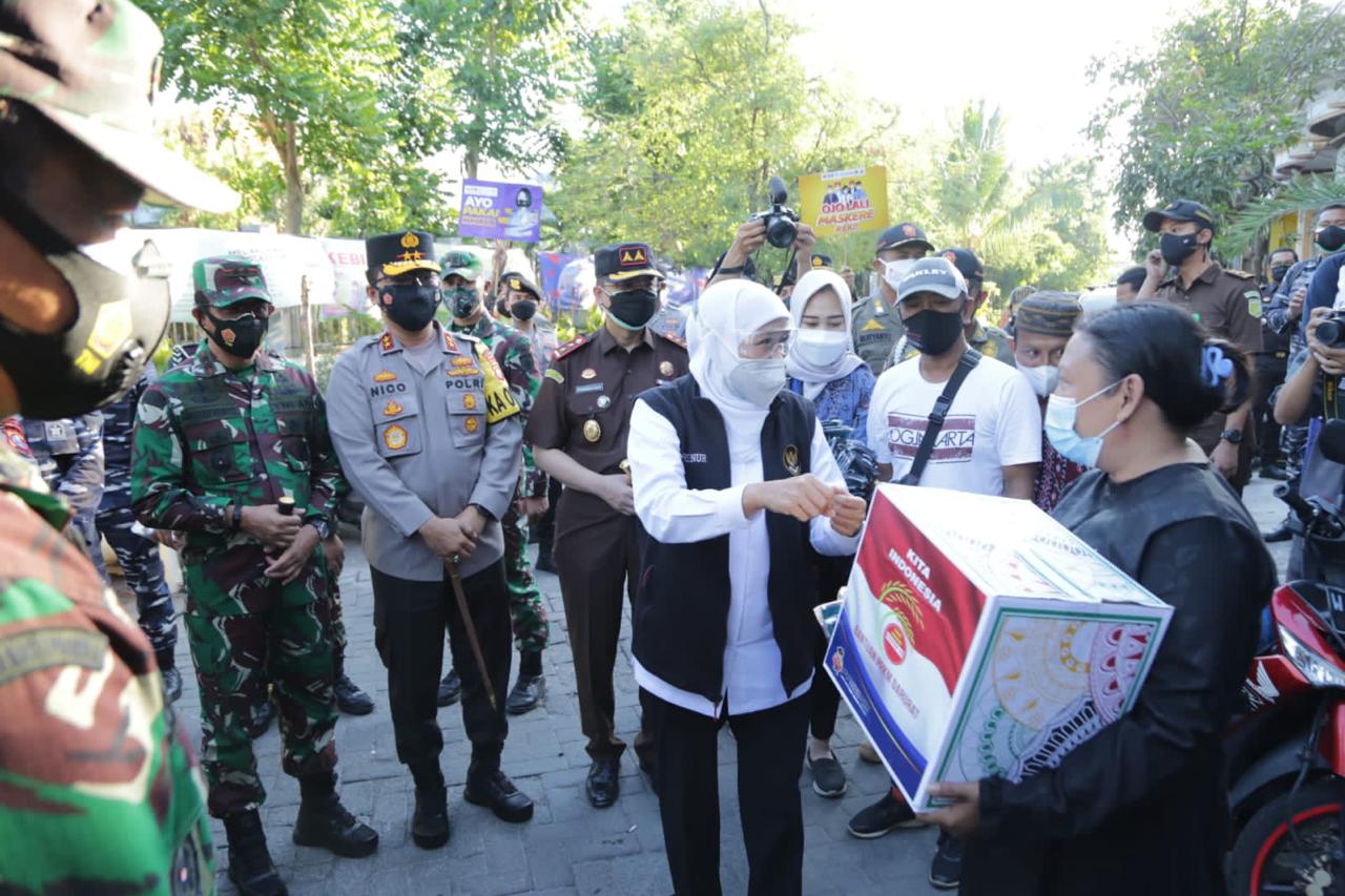 Gubernur Jawa Timur Khofifah Indar Parawansa, Pangdam V Brawijaya Mayor Jenderal TNI Suharyanto, Panglima Komando Armada II (Pangkormada II) Laksamana Muda TNI Iwan Isnurwanto, dan Kapolda Jatim Irjen Pol Nico Afinta, serta didampingi Kabinda Jatim Marsma TNI Rudy Iskandar, Sekda prov, Pejabat Utama Polda Jatim dan Pejabat Utama Kodam V/Brawijaya, membagikan 3000 paket sembako dan masker secara langsung ke Warga Bulak Banteng dan Sekitar Kenjeran, Surabaya.