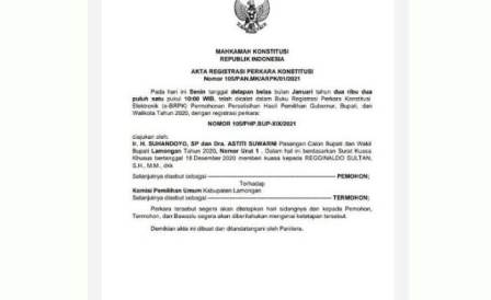 LAMONGAN – Mahkamah Konstitusi (MK) menerbitkan buku registrasi perkara konstitusi (BRPK) untuk permohonan sengketa perselisihan pemilihan kepala daerah (pilkada) serentak 2020, termasuk Pilkada di Lamongan.