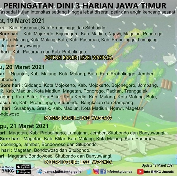 “Waspadai hujan dengan intensitas sedang hingga deras disertai angin kencang sesaat,” berikut keterangan dari BMKG Juanda Surabaya, Jumat (19/3/2021).