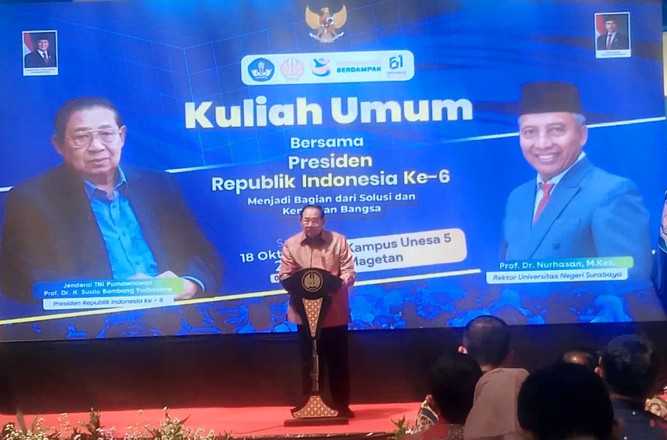 Magetan | jatim.siberindo.co – Presiden Republik Indonesia ke-6, Prof. Dr. H. Susilo Bambang Yudhoyono, M.A. (SBY), memberikan Kuliah Umum di Universitas Negeri Surabaya (UNESA) Kampus Magetan, pada Sabtu (18/10/2025).