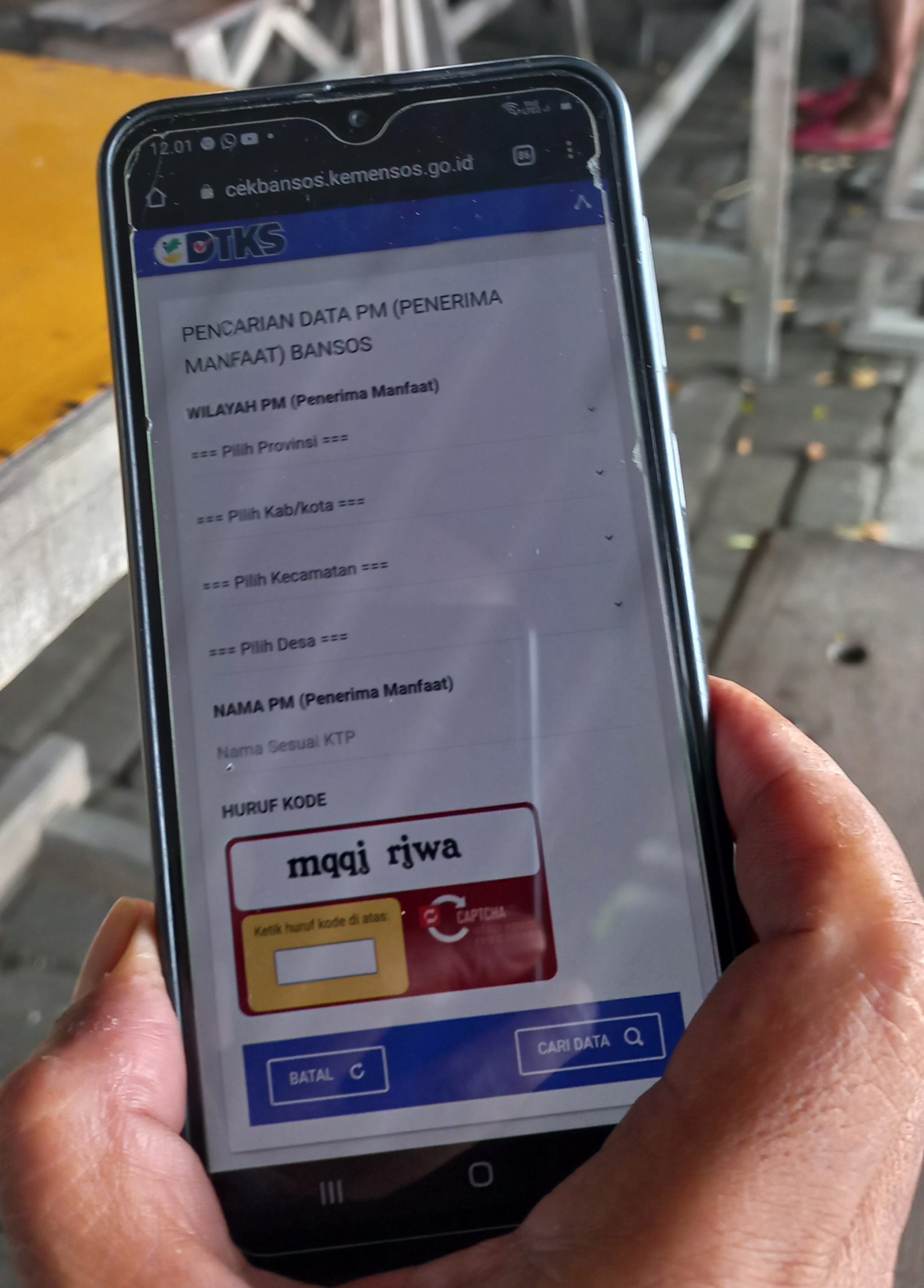Buka link cekbansos.kemensos.go.id, kemudian masukan nama Provinsi, Kabupaten atau Kota, Kecamatan, dan Desa atau Kelurahan sesuai dengan Kartu Tanda Penduduk (KTP).