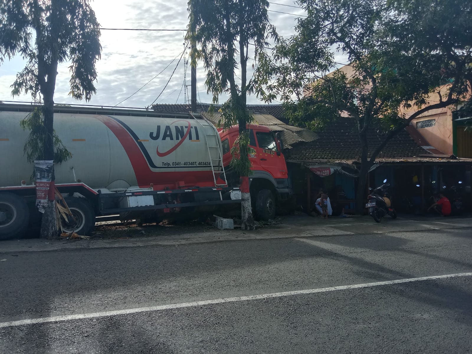 Satu unit Truk Tangki Buld Semen Curah Kendaraan Milik PT. Janti Sarana Material perwakilan Tuban dilaporkan menabrak pagar dan taman Polsek Ngimbang, tugu desa, serta teras toko milik warga.