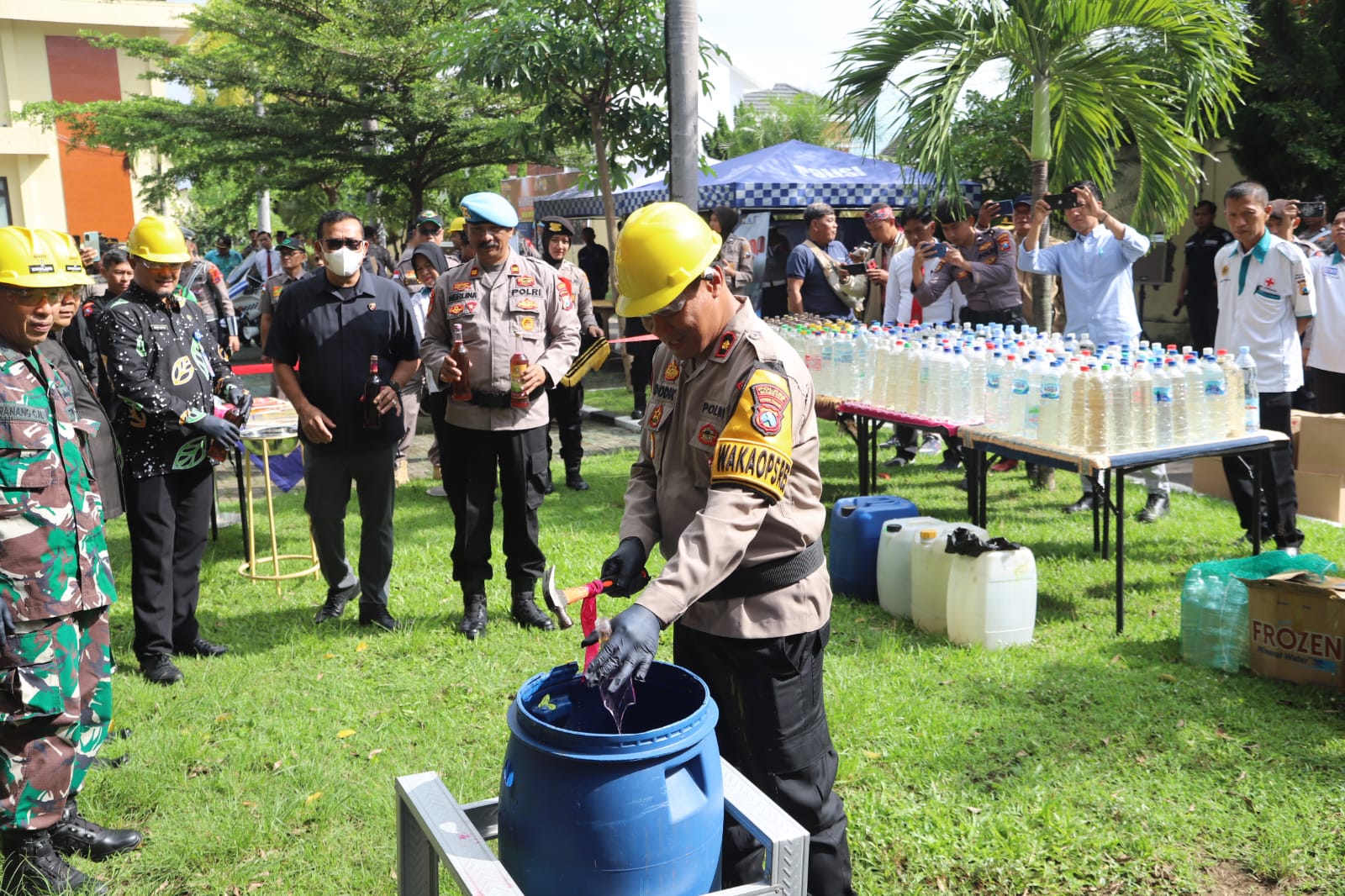 Barang bukti yang dimusnahkan terdiri dari 620,5 liter arak Jawa, 192 botol anggur merah (Amer), serta 40 knalpot brong, dari hasil sitaan operasi pekat selama Ramadan dan menjelang Lebaran.