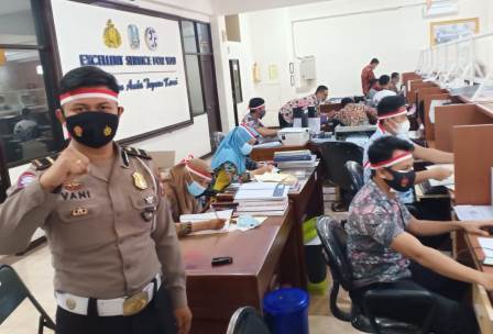 Selain mengutamakan Pelayanan yang prima dalam melayani masyarakat wajib pajak, ada pemandangan lain dengan penampilan para petugas samsat pada hari ini , selain seragam pelayanan yang digunakan pada hari hari biasanya petugas dilengkapi dengan ikat kepala warna sang warna pusaka merah putih.