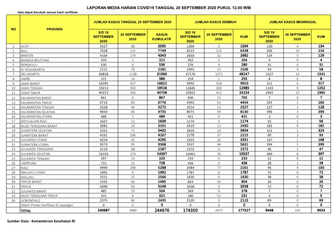 Berdasarkan data “15 Besar” Nasional. Penambahan selama 7 hari (13-20/9/2020)