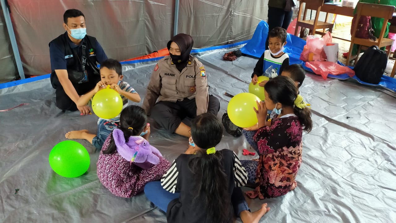 NGANJUK – Anggota Polres Nganjuk memberikan bantuan trauma healing bagi korban tanah longsor khususnya bagi anak-anak di posko pengungsian gedung SDN Ngetos III di Dusun Selopuro, Desa Ngetos, Kecamatan Ngetos, Kabupaten Nganjuk.