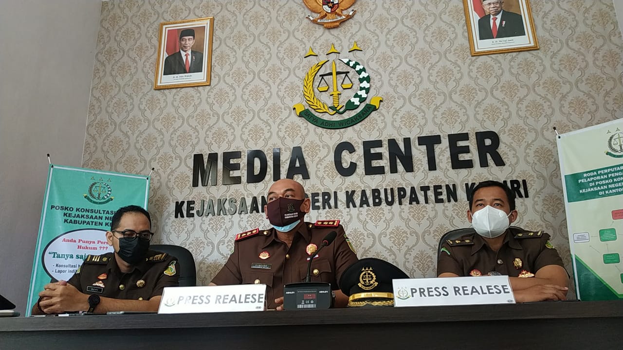 Pejabat dengan inisial “S” yang menjabat pada bidang Pelayanan Informasi Publik, hari ini resmi ditetapkan sebagai tersangka, dalam reles resmi Kejari Kab Kediri, Rabu (21/7/2021) diruang media center Kejaksaan Negeri Kab Kediri.