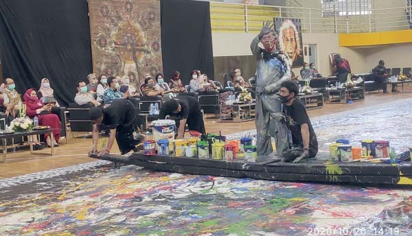 BATU – Jupri Abdullah (AJ), pelukis Kota Batu mengklaim lukisan abstraknya terbesar dan memcahkan rekor dunia. AJ melukis di kain sepanjang 19 meter dan lebar 3 meter dalam kegiatan Konser Lukis Abstrak bagian dari Kongres Kebudayaan, di GOR Gajahmada Kota Batu, Selasa (20/10/2020).