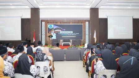 Seminar Nasional yang mengambil tema “Merdeka Belajar Dalam Mewujudkan SDM Kompetitif di Era Digital” tersebut menghadirkan narasumber yakni seorang Guru Besar dari Universitas Brawijaya Malang Qomaritus Sholikhah. Profesor berdarah Lamongan itu memberikan tips tentang posisi yang harus diambil guru ditengah canggihnya teknologi dikalangan siswanya. Dimana guru harus menjadi fasilitator dengan managenement by lovenya.
