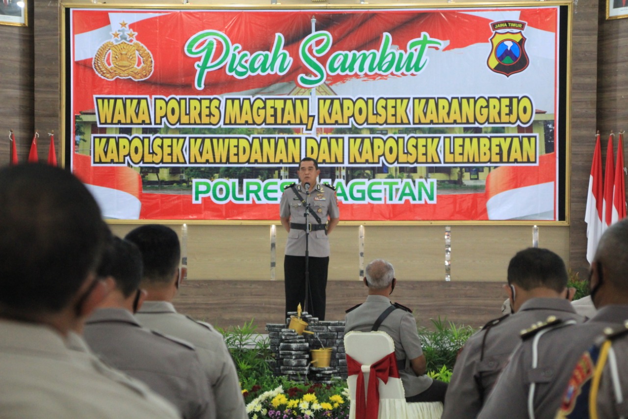 Kapolres Magetan mengucapkan terima kasih kepada pejabat yang lama atas apresiasi atas dedikasinya. “Situasi Kamtibmas di Kabupaten Magetan yang kondusif tidak lepas dari kinerja rekan-rekan sekalian,” jelasnya.