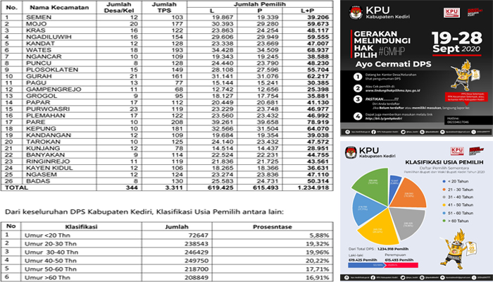 “Ayo cermati DPS Pilbup Kediri 2020 ini. Pastikan diri Anda, Saudara, dan keluarga serta teman Anda telah terdaftar sebagai pemilih dalam Pemilihan Bupati dan Wakil Bupati Kediri tahun 2020. Apabila nama Anda belum tercantum dalam DPS, silahkan menghubungi PPS di desa masing-masing,” katanya.