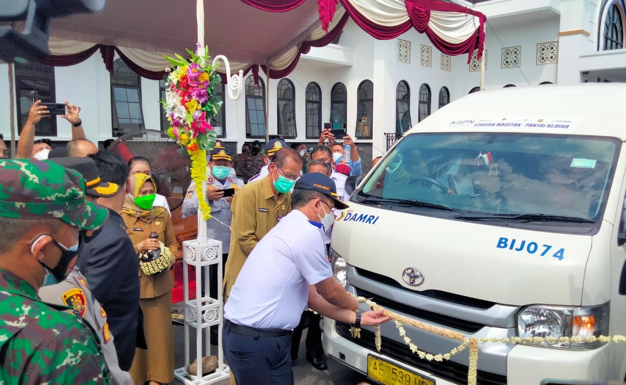 MAGETAN – Dalam mendongkrak sektor pariwisata di Kabupaten Magetan, Bupati Suprawoto secara resmi melaunching Trayek DAMIR jalur Stasiun Magetan menuju Pantai Klayar Pacitan. Acara tersebut diselenggarakan di Stasiun Magetan, tepatnya di Kecamatan Barat Kabupaten Magetan, Selasa (23/03/2021).