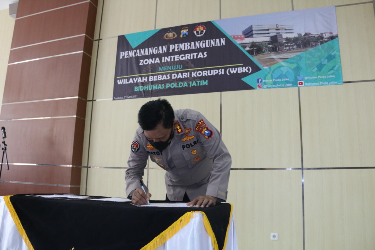 SURABAYA, – Pencanangan pembangunan zona integritas menuju WBK (Wilayah Bebas Korupsi) dan WBBM (Wilayah Birokraei Bersih Melayani) Satuan Kerja (Satker) Bidang Humas Polda Jatim serta 12 Satker yang lain di Polda Jatim.