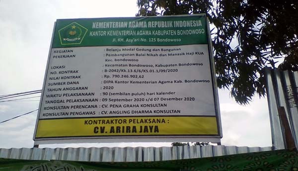 Sekadar informasi, pembangunan Balai Nikah dan Manasik Haji KUA di Kecamatan Bondowoso itu, nilai pagunya Rp. 790.246.902,62. Sumber dananya dari DIPA Kantor Kementerian Agama Kabupaten Bondowoso tahun anggaran 2020. Nomor kontrak B-2042/KK.13.6/6/KS.01.1/09/2020. Konsultan Perencana CV. Pena Graha Konsultan, konsultan pengawas CV. Angling Dharma Konsultan dan kontraktor pelaksana CV. Arira Jaya. (tif/petisi.co)