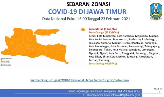 “Update terbaru dari pusat, zonasi pekan ini di Jatim tidak ada zona merah. Seluruh kabupaten/kota zona oranye,” ujar Jubir Satgas Covid-19 Jatim, dr Makhyan Jibril saat dikonfirmasi detikcom, Rabu (24/2/2021).