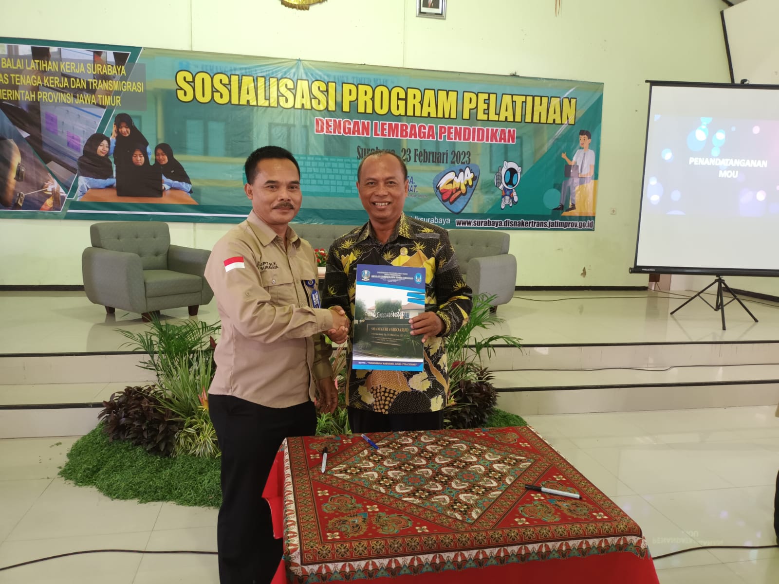 Kerjasama tersebut diperkuat dengan teken MoU (Memorandum of Understanding) oleh kedua belah pihak. MoU ditandatangani oleh Kepala Plt. UPT BLK Surabaya Sunarya SE, MM dan Kepala SMAN 4 Sidoarjo Dr. Imam Jawahir, M.Pd pada Kamis (24/2/2023) di Kantor UPT BLK Surabaya, Jl. Dukuh Menanggal III/29 Surabaya.