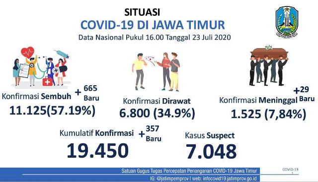 SURABAYA (Suarapubliknews) – Dalam sepekan, jumlah pasien sembuh Covid-19 di Jawa Timur terus bertambah melebihi kasus positif baru. Kamis (23/7), total pasien yang terkonfirmasi negatif Covid-19 atau sembuh mencapai 665 orang sehingga total pasien sembuh menjadi 11.125 atau setara 57,19 persen.