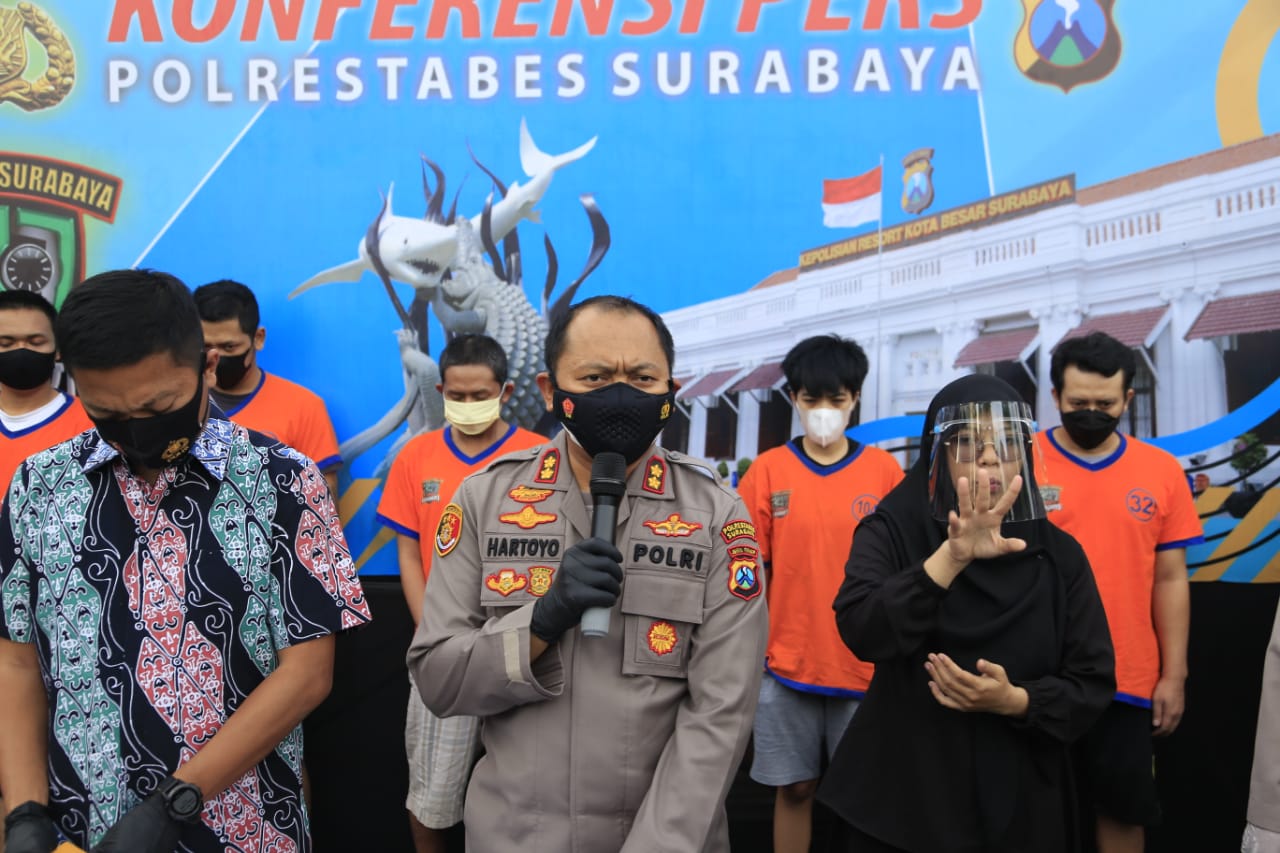 “Yang pertama ditangkap adalah saudari CH kemudian saudara CL. Ini diamankan di sebuah Bandara yang ada di Surabaya. Kemudian dari situ kita kembangkan kepada tiga tersangka yang lain,” ucap AKBP Hartoyo, saat pimpin konferensi pers di Halaman Utama Polrestabes Surabaya, Jum’at (25/06/2021).