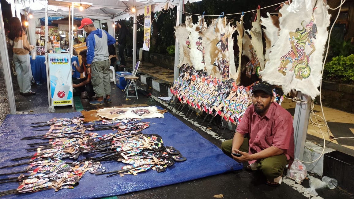 Hujan deras yang mengguyur sejak sore hari membuat suasana di sekitar lokasi pertunjukan lesu, dan berdampak langsung pada omzet pedagang, termasuk Suprianto, penjual wayang asal Solo.