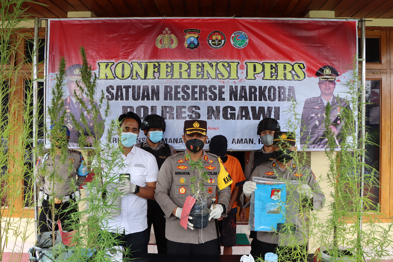 Ada beberapa batang pohon ganja yang berhasil diamankan oleh jajaran SatresNarkoba Polres Ngawi, di pekarangan rumah tersangka. Dari kesembilan pohon ganja tersebut, ada beberapa umur pohon ganja dengan tinggi 30 cm s/d tinggi 270 cm.