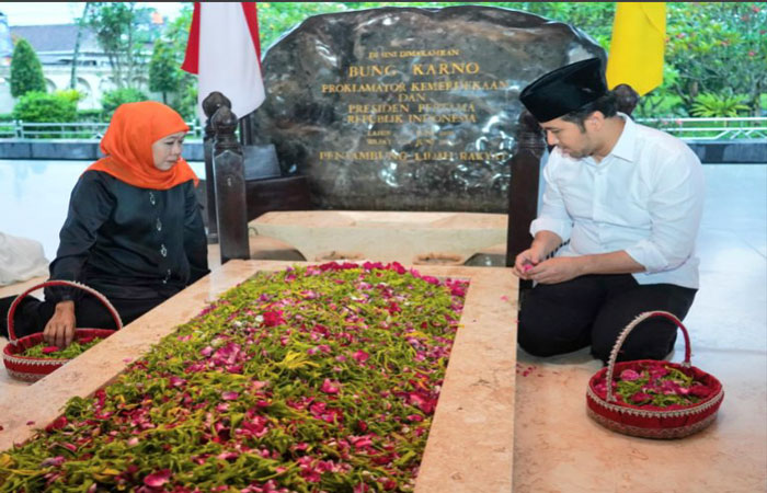 BLITAR | Jatim.siberindo.co – Pasangan calon Gubernur dan Wakil Gubernur Jawa Timur nomor urut 2, Khofifah Indar Parawansa dan Emil Elestianto Dardak, melanjutkan rangkaian ziarah mereka dengan mengunjungi makam Proklamator RI, Soekarno, di Blitar, Minggu (24/11). Setelah sebelumnya mengunjungi makam pendiri NU KH Hasyim Asy’ari dan KH Abdurrahman Wahid, Khofifah dan Emil memanjatkan doa dan menaburkan bunga di pusara Bung Karno sebagai bentuk penghormatan.