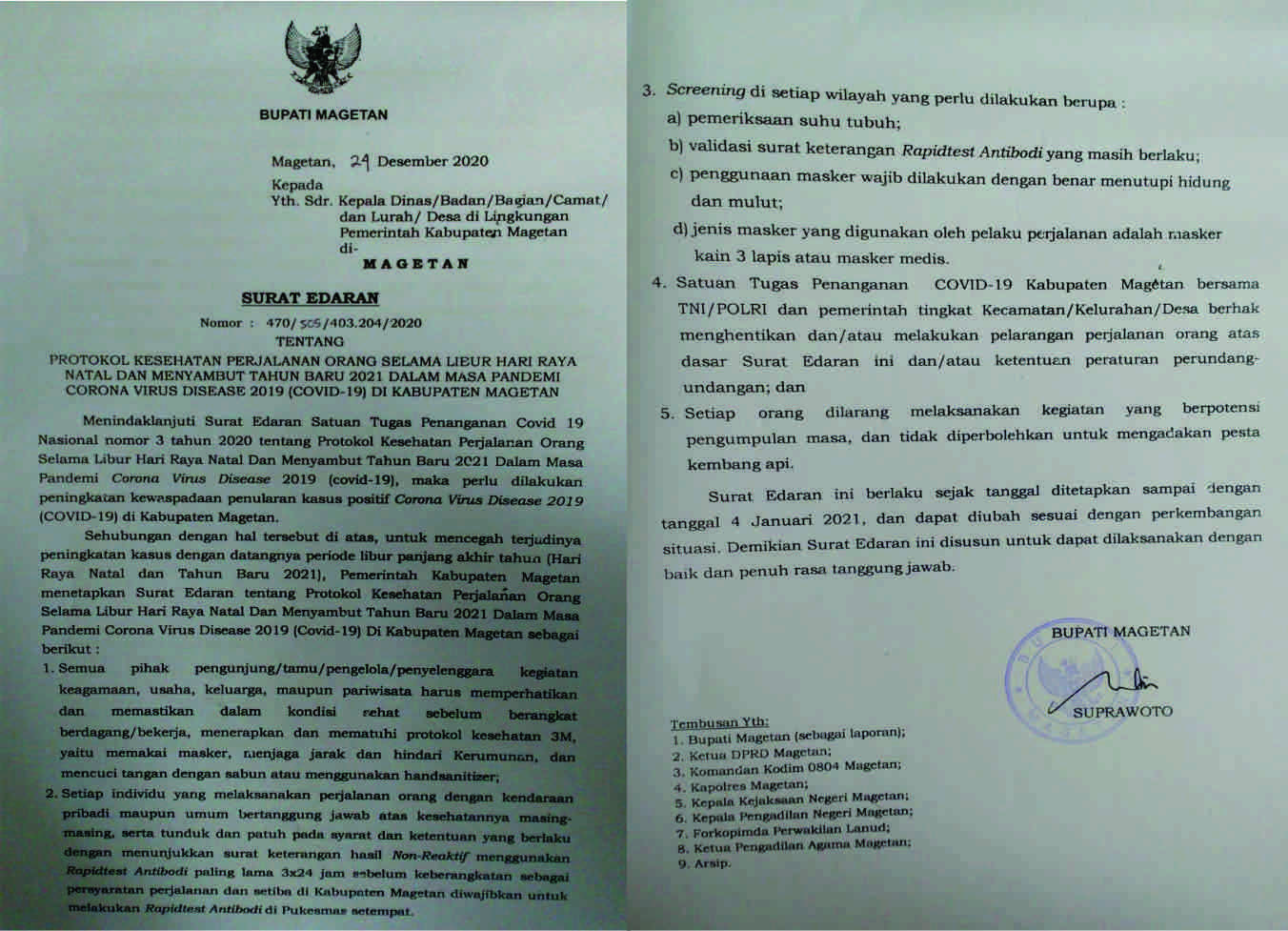 Bupati Magetan, menerbitkan Surat Edaran (SE) tentang Protokol Kesehatan Perjalanan Orang Selama Libur Hari Raya Natal dan Menyambut Tahun Baru 2021 Dalam Masa Pandemi Covid-19 di Kabupaten Magetan. Kamis (24/12/2020).