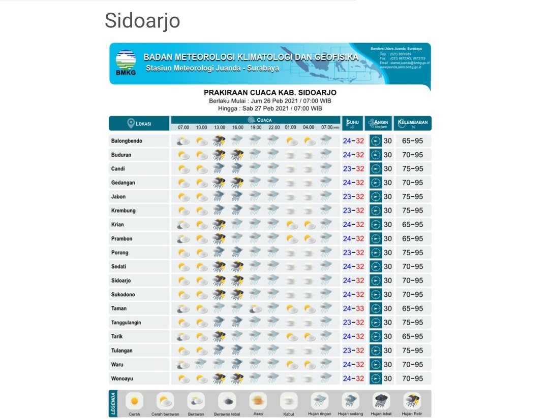 Berdasarkan data BMKG Juanda, siang ini, pukul 13.00 WIB diperkirakan akan terjadi hujan lebat disertai petir di 10 kecamatan di Sidoarjo. Kecamatan Candi, Jabon, Krembung, Porong, Tanggulangin, dan Tulangan akan diguyur hujan sedang. Sedangkan Kecamatan Taman dan Waru akan hujan dengan intensitas ringan.