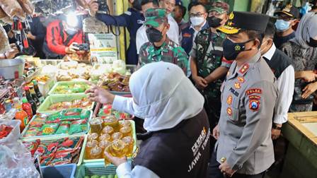 SURABAYA | jatim.siberindo.co – Forkopimda Jawa Timur, Gubernur Jatim, Khofifah Indar Parawansa, Pangdam V/Brawijaya, Nurcahyanto, Kapolda Jatim, Irjen Pol Nico Afinta bersama Kadisperindag Jatim, pejabat utama (PJU) Kodam V/Brawijaya, PJU Polda Jatim dan Satgas Pangan Jatim, Kamis (26/5/2022) pagi melakukan pengecekan harga dan distribusi minyak goreng di Pasar Soponyono, Rungkut, Surabaya.