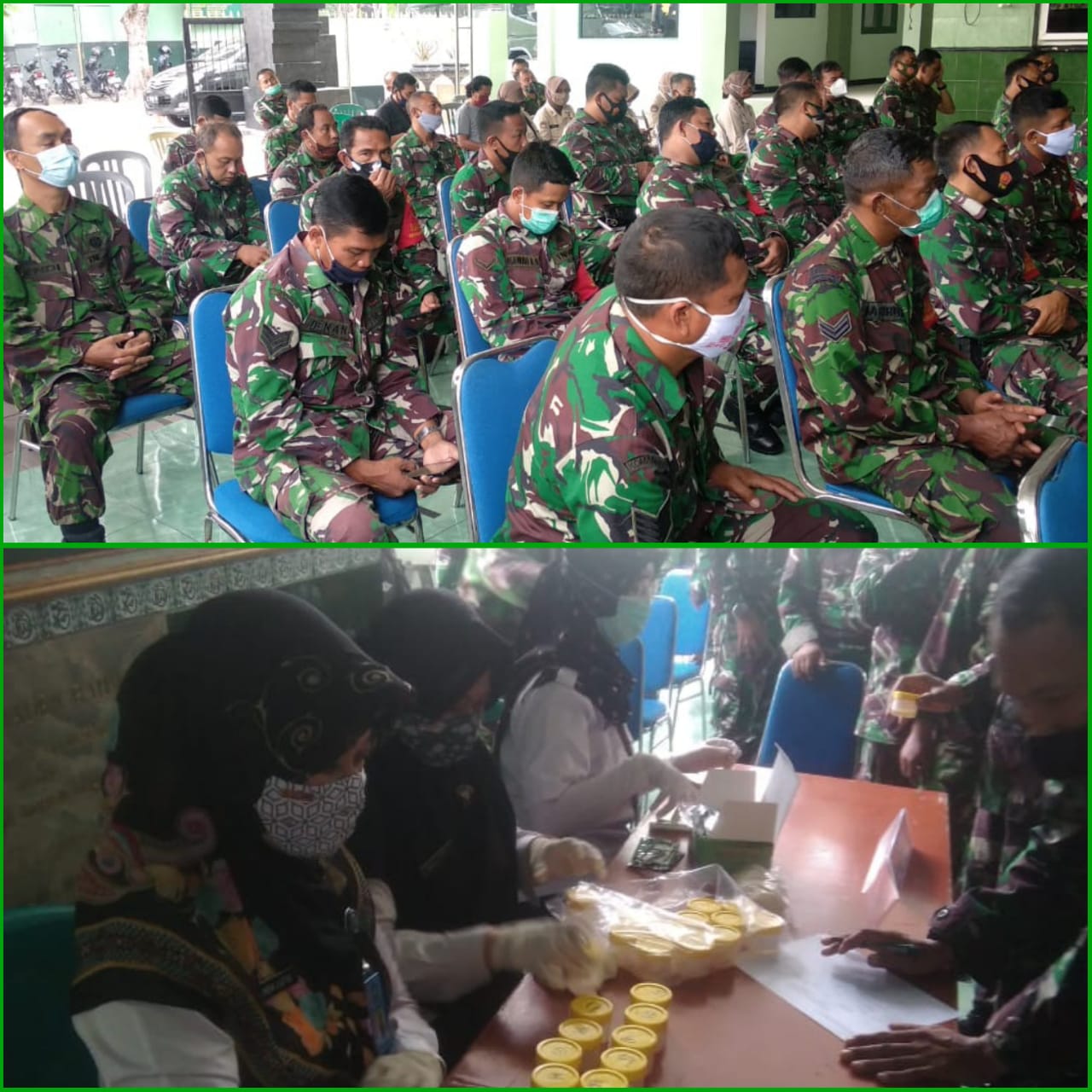 Pelaksanaan di Kodim 0832 SS, Kamis, (26/11/2020) dengan mengikuti prosedur protokol kesehatan (prokes) Covid-19, para personil berkumpul di Aula Kodim 0832 untuk mendapatkan paparan materi P4GN dan melakukan tes urine.