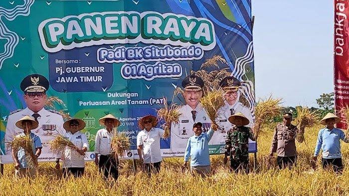 Situbondo, SIBERINDO.CO – Penjabat (Pj) Gubernur Jawa Timur (Jatim) Adhy Karyono bersama Bupati Situbondo Karna Suswandi panen raya padi BK 01/02 Agritan yang merupakan bibit varietas unggul baru dan mampu memproduksi padi hingga hampir 9 ton per hektare.