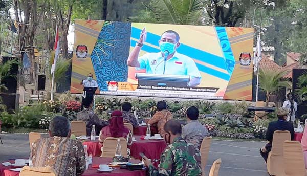 SURABAYA – Kedua pasangan calon (Paslon) Wali Kota dan Wakil Wali Kota (Wawali Kota) Surabaya, nomor urut 1, Eri Cahyadi- Armuji dan nomor urut 2, Machfud Arifin dan Mujiaman Sukirno beradu pandangan untuk pemimpin Surabaya di Deklarasi Kampanye Damai yang diselenggarakan oleh KPU Kota Surabaya di Hotel Singgasana, Sabtu (26/9/2020).