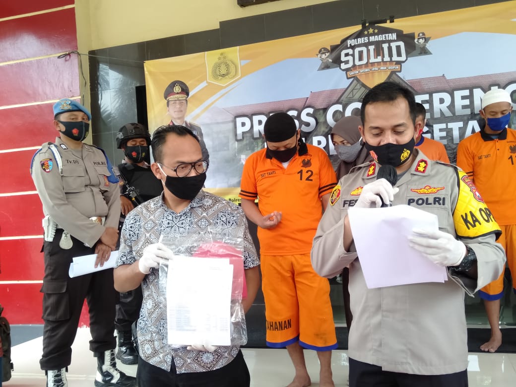Kedua tersangka harus mendekam di jeruji besi, setelah kelima korbannya melaporkan tersangka ke Polres Magetan. Hal ini disampaikan Kapolres Magetan AKBP Vesto Ari Permana, dalam Konferensi Pers, pada hari Jumat (27/11/2020).