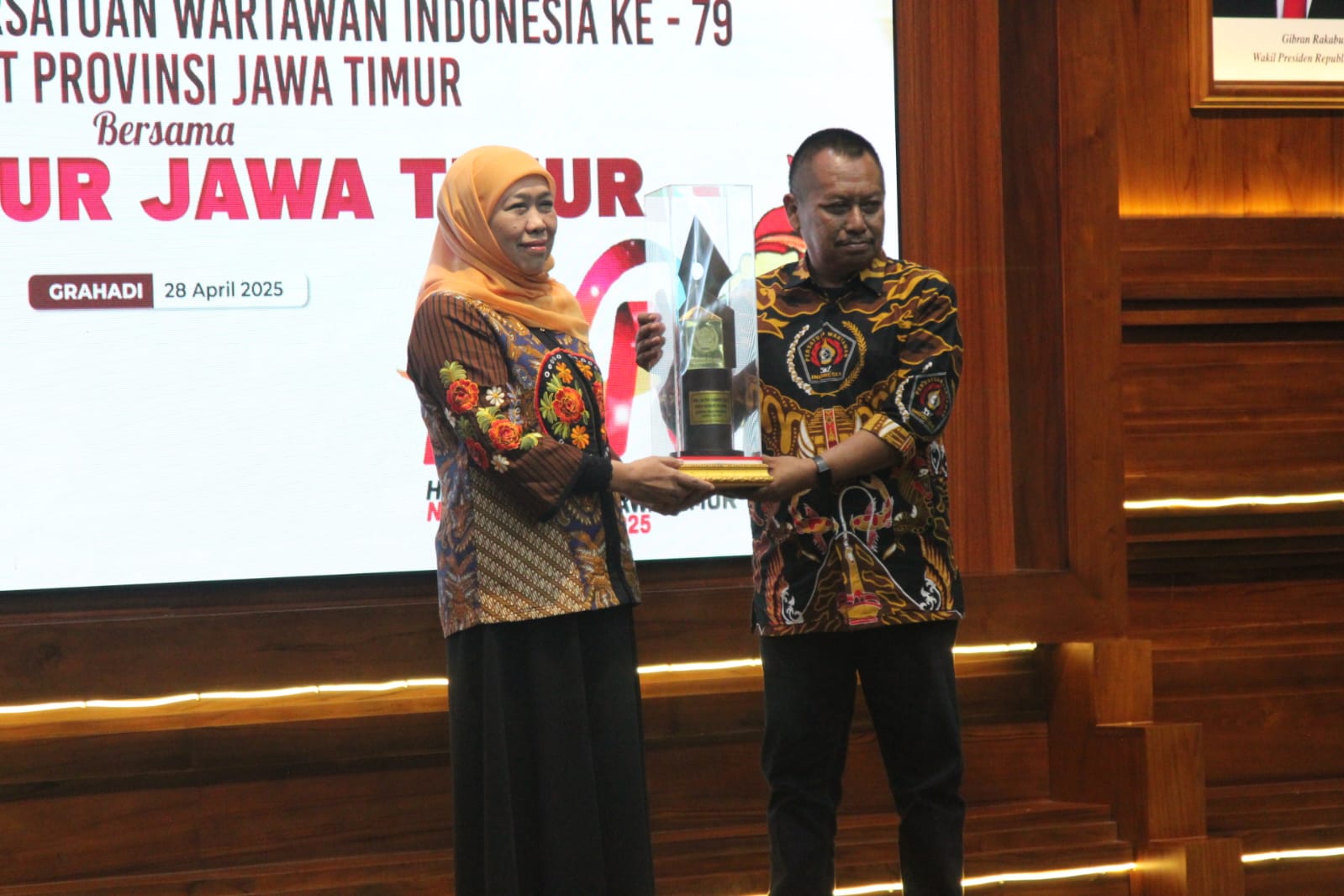 SURABAYA (SIBERINDO), – Gubernur Jawa Timur Dr. Hj. Khofifah Indar Parawansa, MSi dianugerahi Penghargaan PWI Jawa Timur sebagai tokoh Penggerak Ekonomi Regional, bersama belasan tokoh lainnya, di acara Puncak Hari Pers Nasional (HPN) 2025 dan Hari Ulang Tahun ke-79 PWI tingkat Jawa Timur yang digelar di Gedung Negara Grahadi, Senin 28 April 2025 malam.