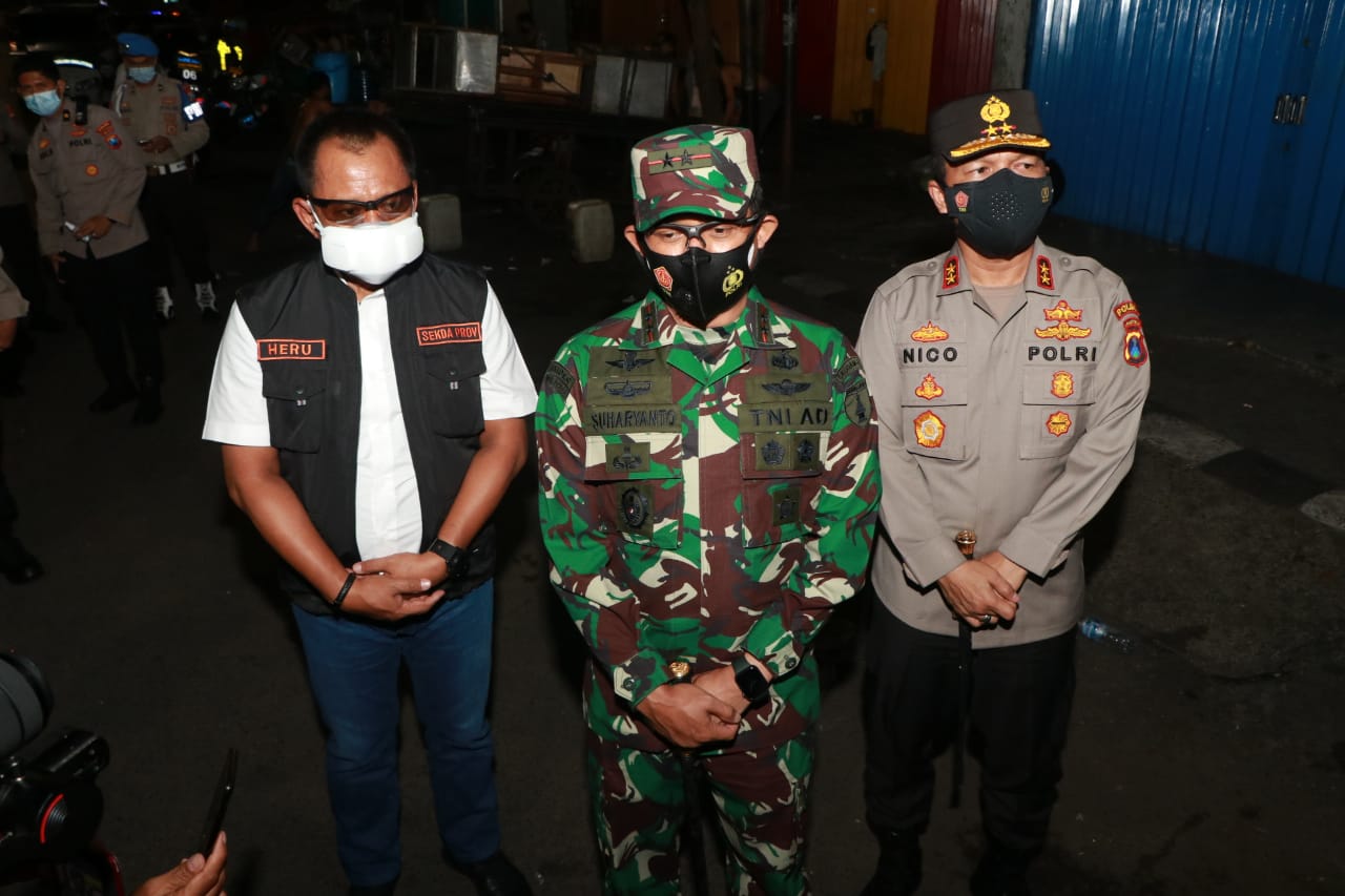 Forkopimda Jatim diantaranya ada Pangdam V/Brawijaya Mayor Jenderal TNI Suharyanto, Kapolda Jatim Irjen Pol Nico Afinta dan Gubernur Jatim yang diwakili oleh Plt. Sekdaprov Jatim Heru Tjahjono, Selasa malam (29/6/2021), melakukan sosialisasi jelang pemberlakuan PPKM Darurat di Jalan Kedungdoro, Surabaya.