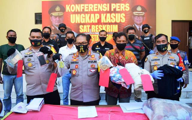 Beberapa barang bukti yang berhasil disita petugas diantaranya yakni Gunting, baju tersangka, sprei ada bekas darah korban, selimut warna biru, baju korban, Gelang 4 buah, cincin 9 buah, anting 5 pasang, Liontin 1 buah 2 buah Hp korban dan uang Rp 5 juta.