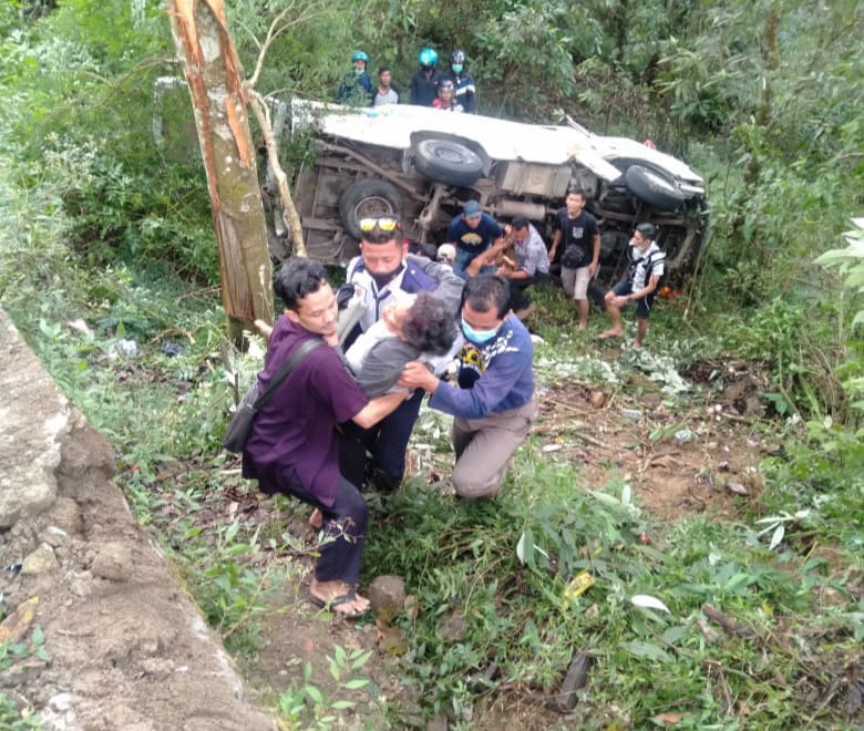 Mengingat kondisi jalan menurun disertai tikungan tajam, kecelakaan pun tak terhindarkan hingga masuk jurang. Kondisi bus terbalik. Sedangkan seorang penumpangnya tewas tergencet bodi bus. Sementara para penumpang yang terluka akibat benturan interior kendaraan.