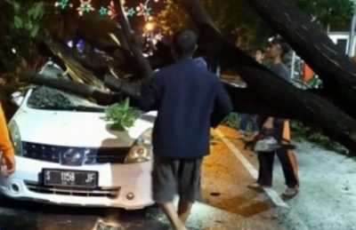 “Saat kejadian pukul 23.00 WIB, disaat mobil tersebut melintas tiba-tiba ada pohon besar yang tumbang dan langsung mengenai bagian depan bodi mobil tersebut,” katanya.