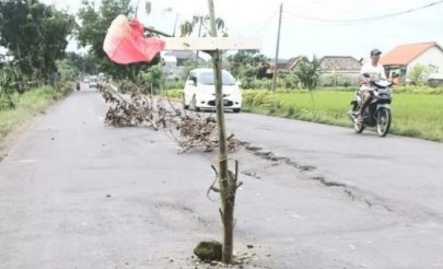Ditambahkan oleh Purwanto, “Tak ingin ada kecelakaan terus menerus terjadi. Warga setempat kemudian memberi tanda dengan menancapi ranting pohon yang dibalut plastik di badan tengah jalan yang rusak parah berlubang itu sehingga pengendara mengetahui dari kejauhan jika jalan tersebut berlubang besar besar dan rusak parah.